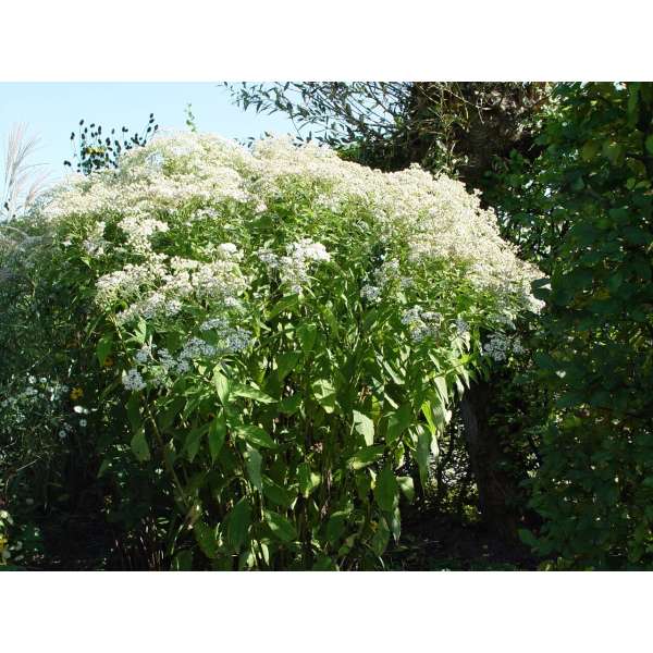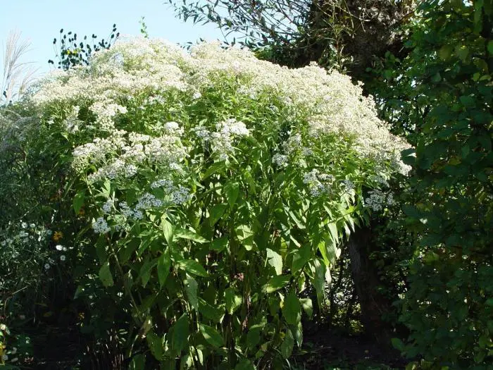 Aster glehnii 'Agleni' bloeit met roomwitte schermbloemige bloemen.