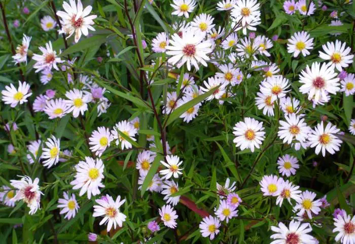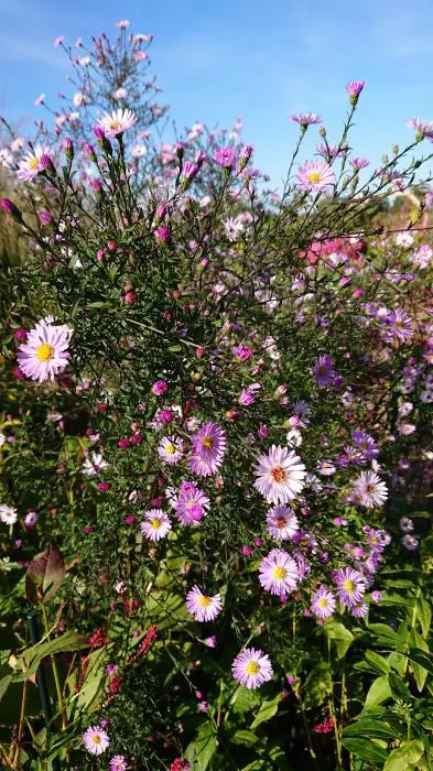 Aster 'Vasterival' is een opgaande, bossige aster met slanke, vertakte, paarszwarte stengels en lansvormige, donkergroene bladeren.
