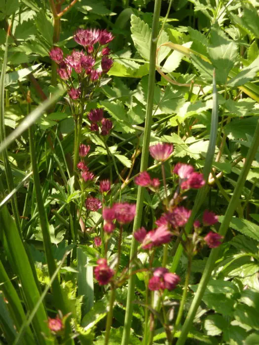 Astrantia major 'Venice' bloeit met zeer mooie donker robijnrode schermvormige bloemen. De bloemen hebben een heel fijne structuur.