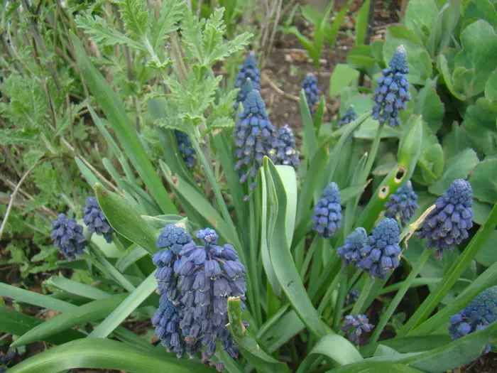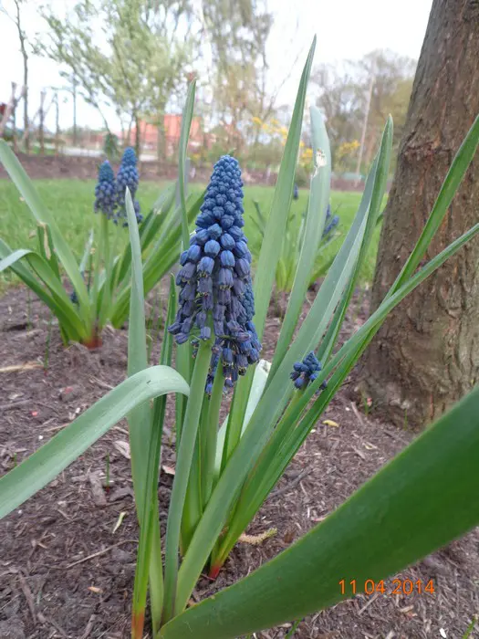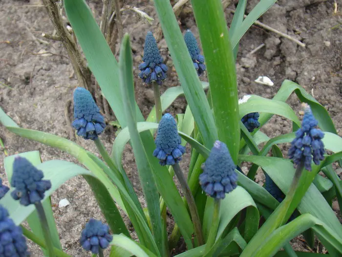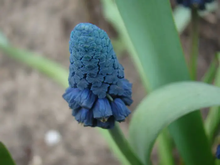 De bloem is een tros blauwe bloempjes, iets matter van kleur dan de gekende blauwe druifjes, wel met dikker blad en minder winterhard.