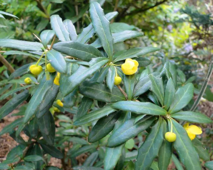 Berberis x frikartii 'Amstelveen' is een heester met licht overhangende gele takken en lange doornen.