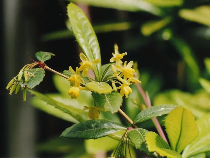 Bloeit in de lente, soms met een nabloei in september, met kleine gele bloempjes gevolgd door kleine blauwzwarte besjes.