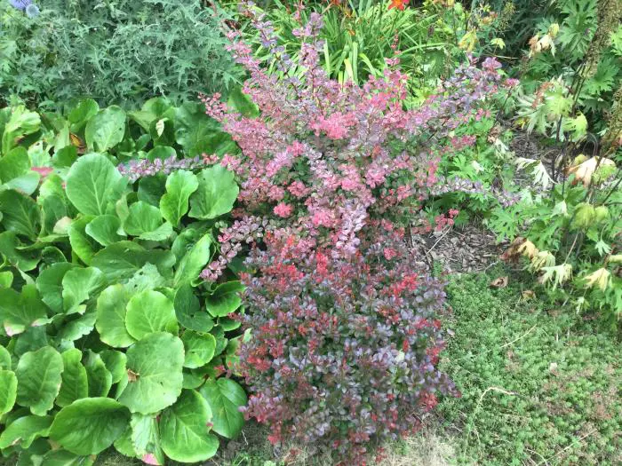Berberis x media 'Parkjuweel' is een prachtige opgaande struik met stevige doornen en glanzende donkergroene blaadjes die in de herfst rood kleuren voor ze afvallen.