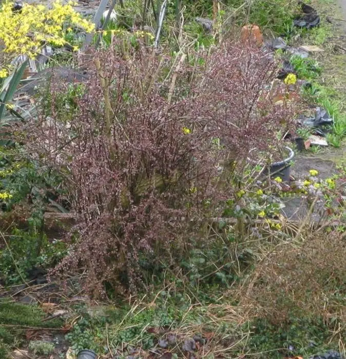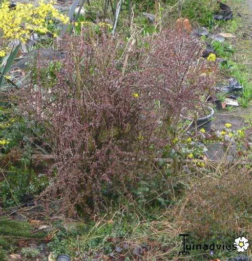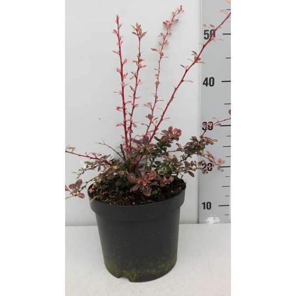 Berberis thunbergii 'Harlequin' is een prachtige, doornige ronde struik met kleine ronde, glanzende rozerode blaadjes, grijs gestipt/gestreept dat mooi verkleurt naar paarsrood in het najaar.