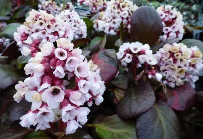Het leerachtig groen blad verkleurt naar paars van zodra de nachten kouder worden en blijft dan de hele winter aan de plant.