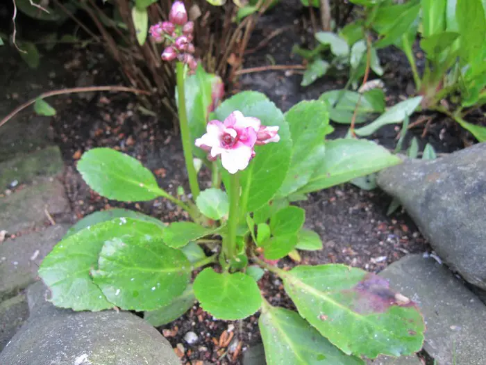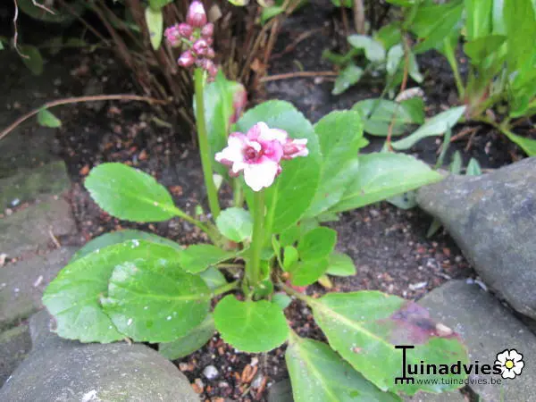 Bergenia DRAGONFLY 'Angel Kiss' bloeit met bleekroze tot wit verkleurende bloempjes.