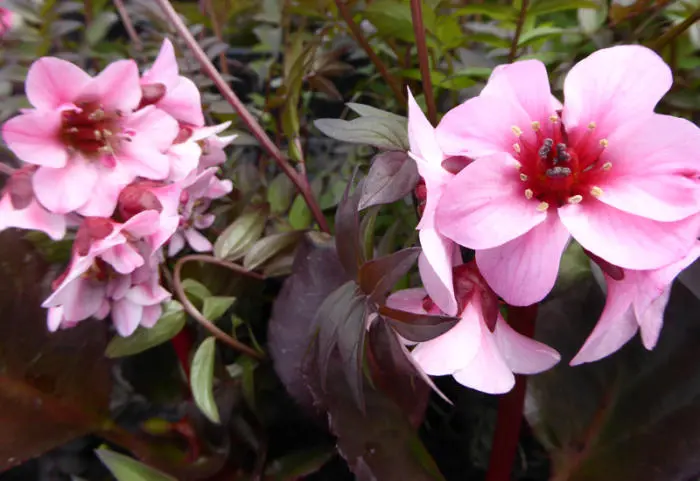 Bergenia DRAGONFLY 'Sakura' bloeit met zachtroze halfdubbele bloemen.