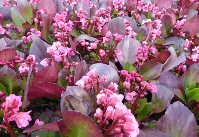 Bergenia 'Flirt' heeft smaller blad en bloeit zeer rijkelijk met donkerroze bloemen.