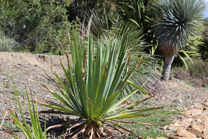 Beschorneria yuccoides vormt dikke vlezige, groengrijze lineair-lancetvormige bladeren.