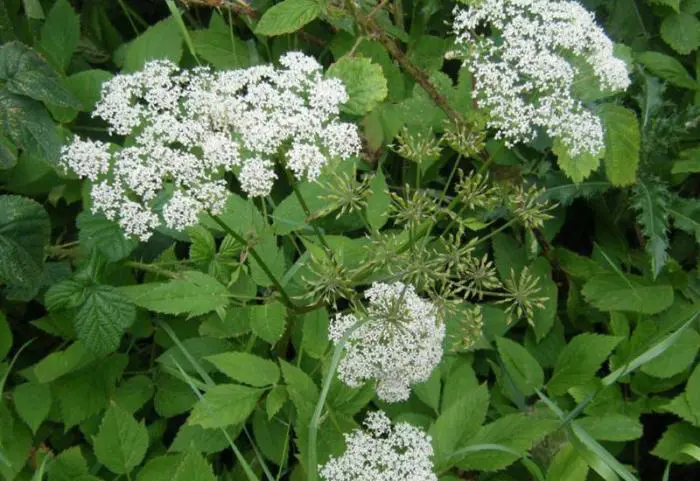 Eens in bloei zijn ze best mooi. Op een hoge stengel bloeien witte schermbloemige bloemen.