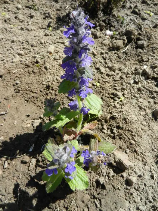 Het is een kruipende vaste plant met lichtgroene bladrozetten en hoge aren samengesteld uit stralend blauwe lipbloemen.