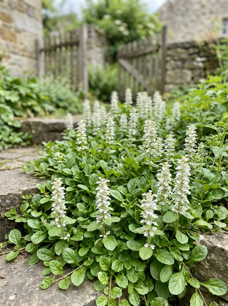Ajuga reptans 'Alba' is een kruipende vaste plant met korte aren samengesteld uit kleine witte bloemen