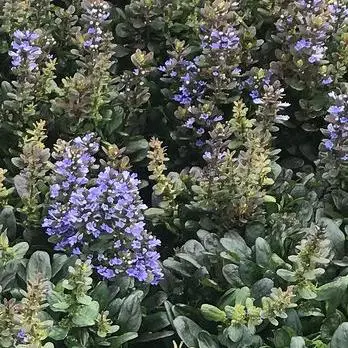 Ajuga reptans 'Blueberry Muffin' is een kruipende vaste plant met korte dikke aren samengesteld uit kleine lavendelblauwe bloemen.