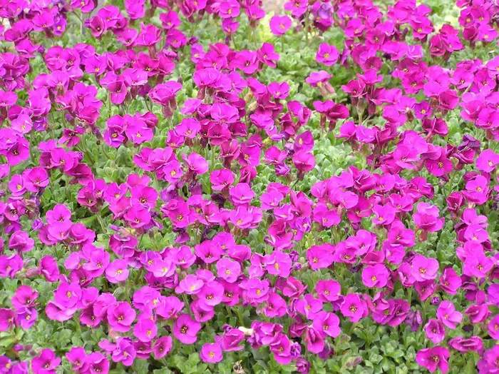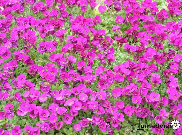 Aubrieta 'Red Carpet' is een zodevormende alpiene plant, vormt gekleurde tapijten van fel karmijnrode bloempjes met een klein geel hartje.