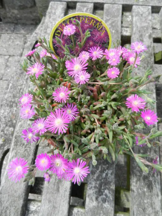 De Delosperma aberdeenense is een wintergroen plant met met fel paarsroze madeliefachtige bloempjes met een geel hart.