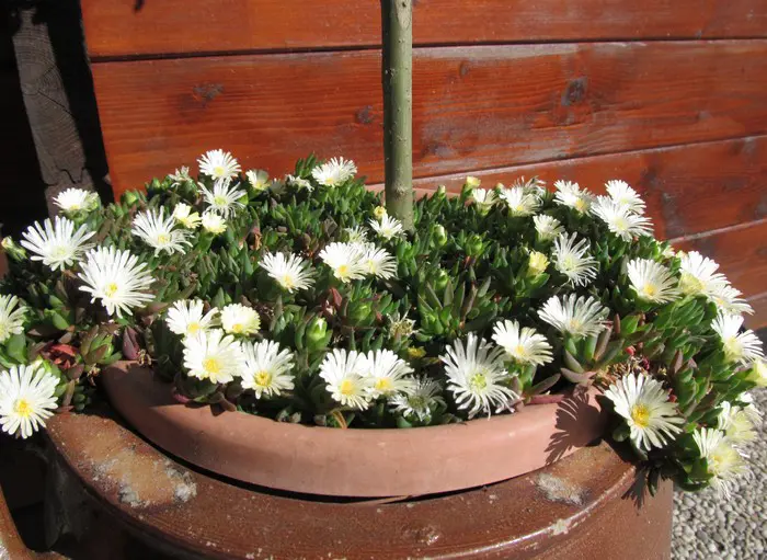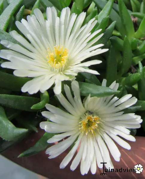 Delosperma congestum 'Alba' bloeit met glanzende witte bloemen en heeft vlezig en dik blad.