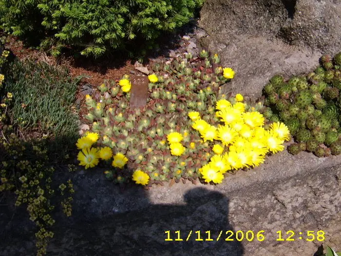 Delosperma congestum bloeit met glanzende gele bloemen en heeft vlezig en dik blad.