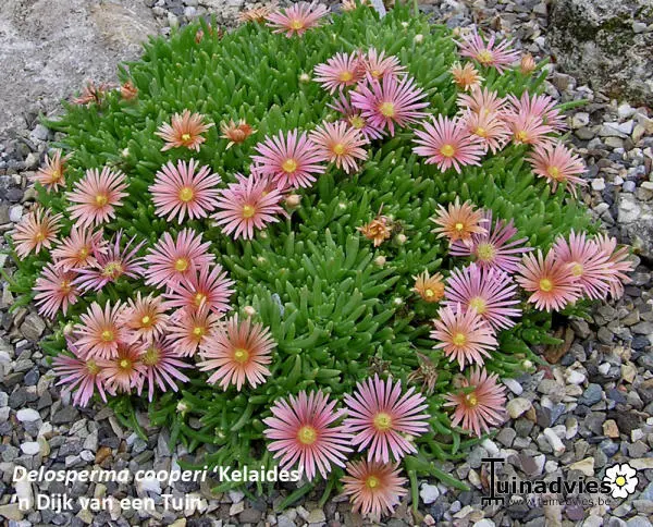 Delosperma cooperi 'Kelaidis' wordt ook als Delosperma cooperi 'Mesa Verde' aangeboden. Panayoti Kelaidis is de directeur van de botanische tuin van Denver.