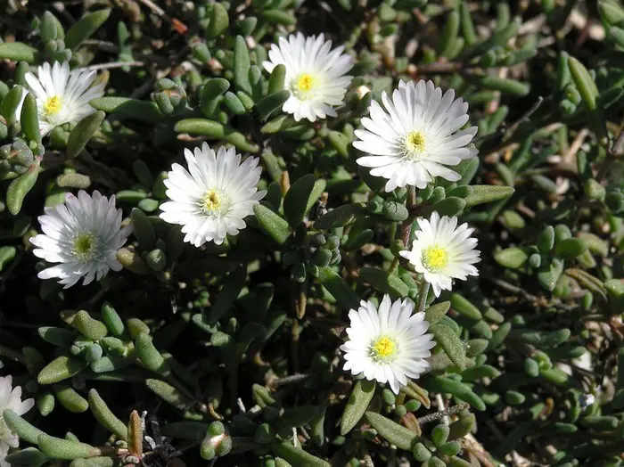 Delosperma 'Graaf Reinet' bloeit met roomwitte bloemen.
