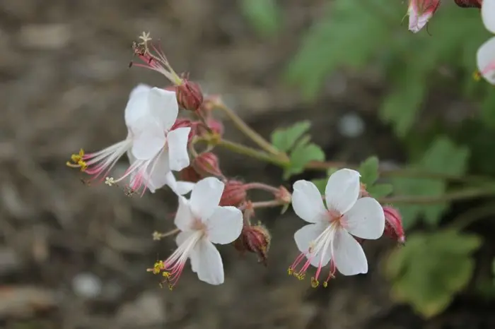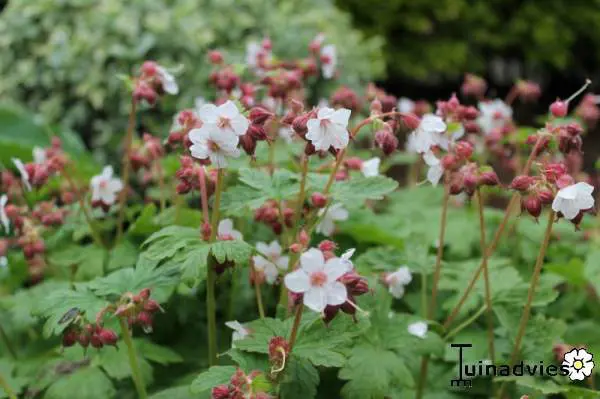 Ze blijven iets lager dan de soort en de bloemen zijn wit bloeiend met een rode kelk en lange roze meeldraden.