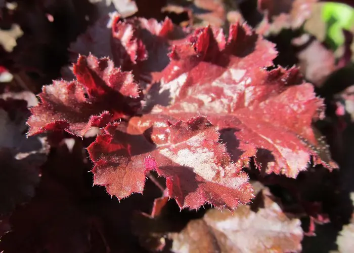 Heuchera 'Melting Fire' is een hybride met mooie donker bordeauxkleurige bladeren met sterk gegolfde randen.