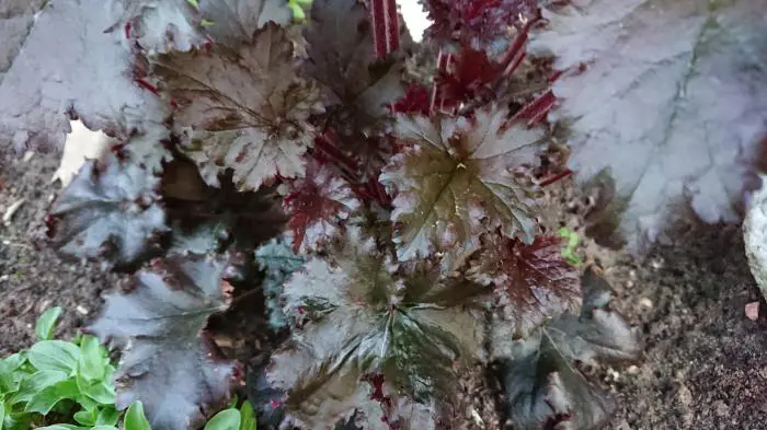 Heuchera 'Black Taffeta' is een purperklokje met grote, sterk gegolfde zwarte bladeren met een zijdeachtige glans.