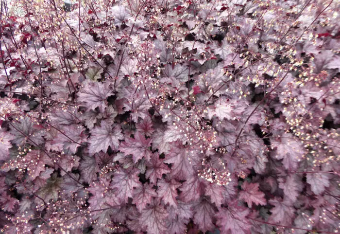 Heuchera heeft zogenaamde wortelbladeren, die met een lange steel direct aan de wortel van de plant vastzitten. De bladeren van alle Heuchera-soorten zijn sierlijk hartvormig.