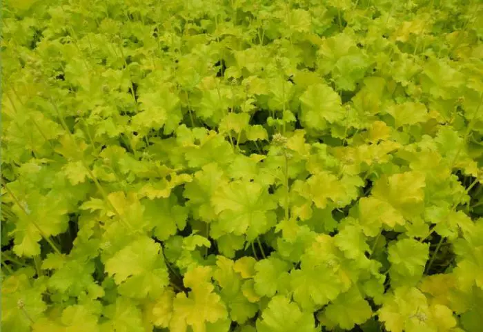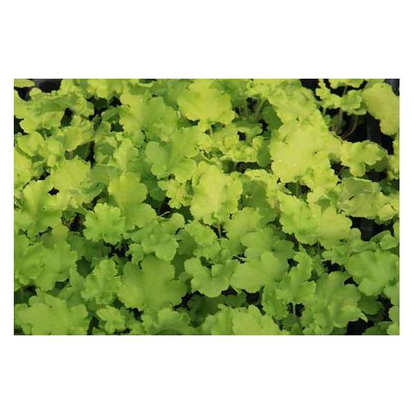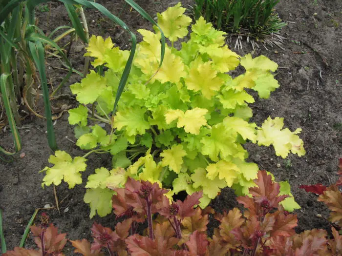 Heuchera 'Lime Marmalade' vormt een ronde pol van limekleurige (groengele) bladeren met bruinrode bloemen.