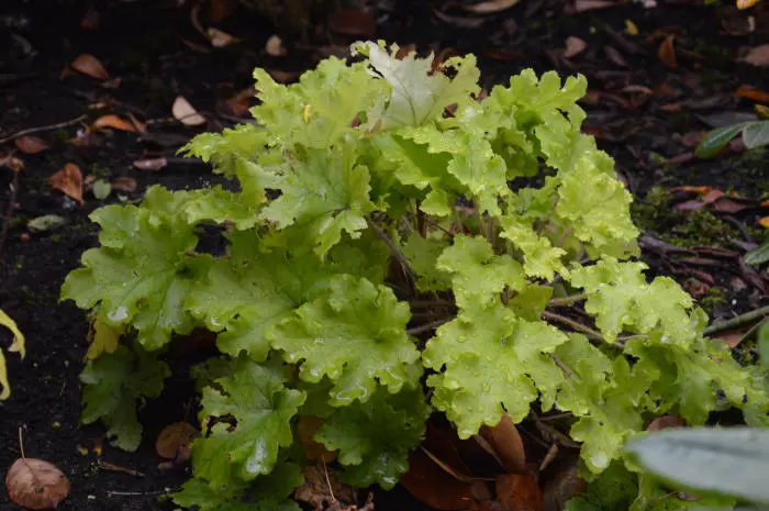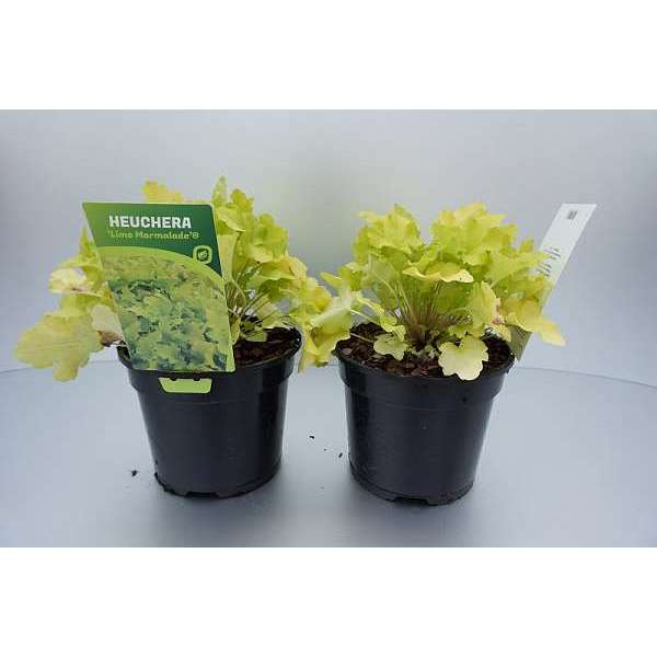 Deze Heuchera is ééntje uit de Marmalade-serie, kenmerkend zijn de leerachtige, gegolfde dikke bladeren.