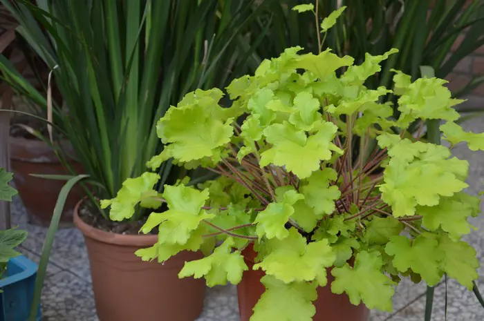 Heuchera's wortelen vrij oppervlakkig en dienen dus iets dieper dan de kroon geplant te worden.