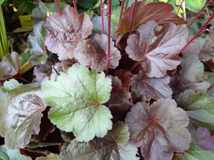 De cultivar 'Blondie' heeft kleine, ronde sterk geaderde bladeren in veranderlijke tinten van groen, brons, caramel, oranje en wijnrood.