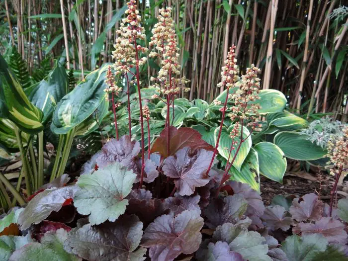Bloeit met goedgevulde pluimen van zacht roomgele bloemen aan rode stelen.
