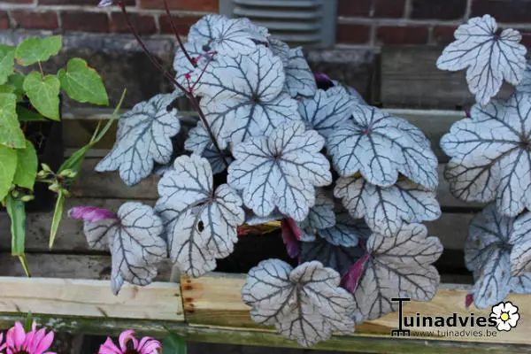 Decoratieve paarsgeaderde, violet/zilveren bladeren met roze bloei.