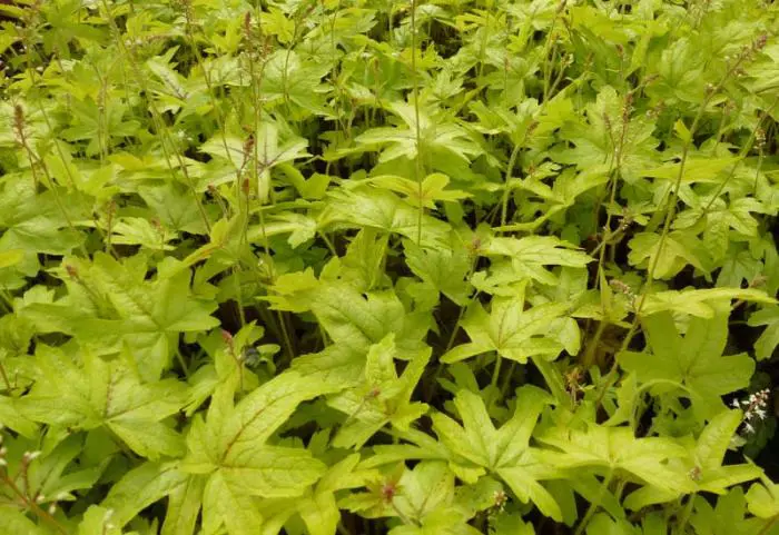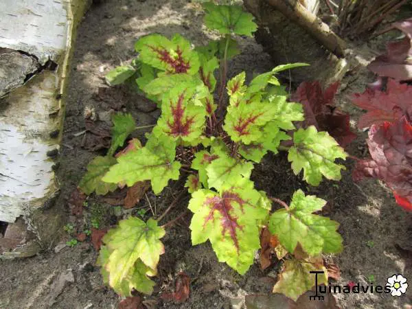 Heucherella is een kruising tussen Heuchera en Tiarella, heeft de typische bloempjes van de Tiarella met de mooie kleuren van de Heuchera.