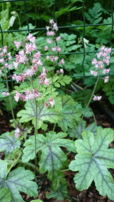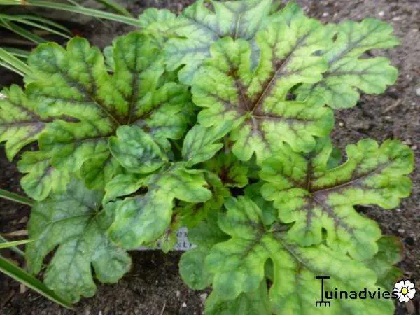 Heucherella is een kruising tussen Heuchera en Tiarella, heeft de typische bloempjes van de Tiarella met de mooie kleuren van de Heuchera.