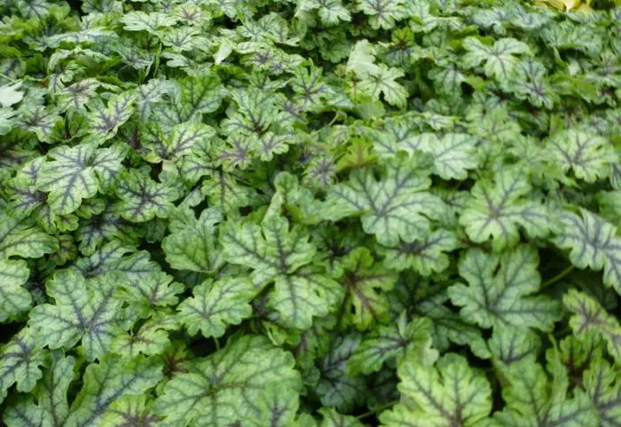 Het zilvergroen blad van Heucherella 'Tapestry' is opvallend getekend met zwarte nerven.