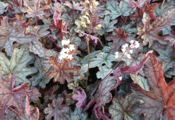 Deze plant is een kruising tussen Heuchera en Tiarella. De Heucherella heeft de typische bloempjes van de Tiarella met de mooie kleuren van de Heuchera.