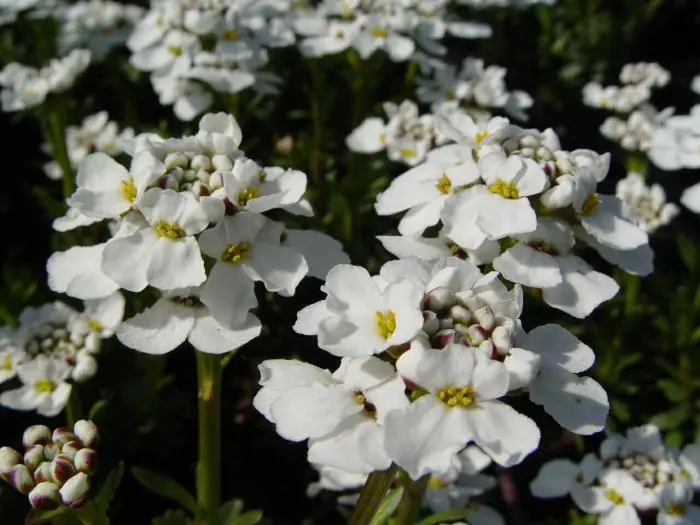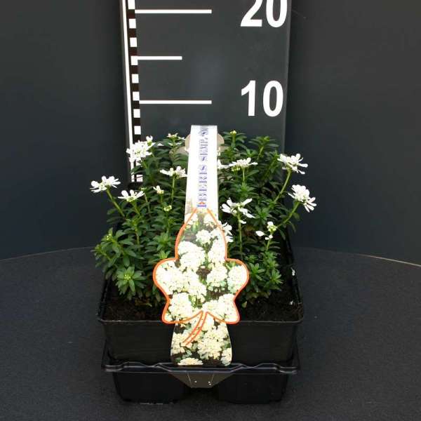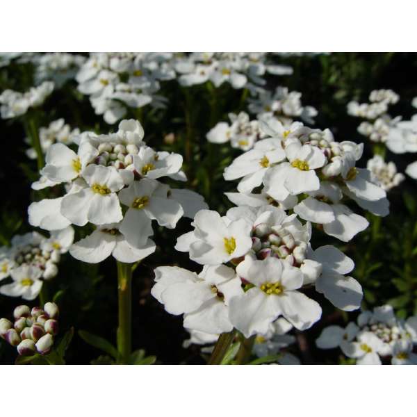 Iberis sempervirens 'Snowflake' zijn zeer sterke planten met lancetvormige donkergroene bladeren en geurige witte kransvormige bloemen.