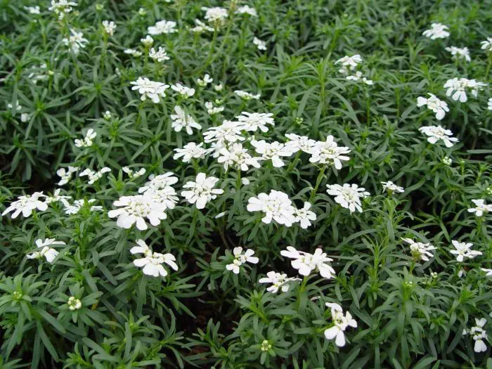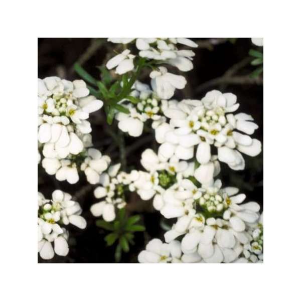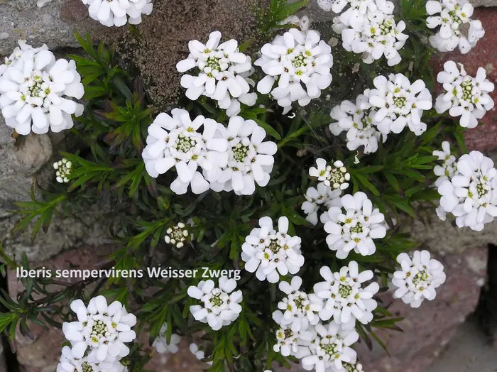 Iberis sempervirens 'Weisser Zwerg' zijn zeer sterke planten met lancetvormige donkergroene bladeren en geurige witte kransvormige bloemen.