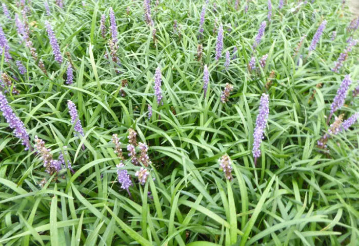 Liriope muscari 'Lilac Wonder' bloeit in augustus/ oktober met vele aren met paarslila bolletjes.