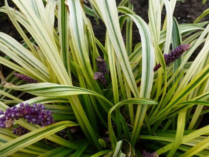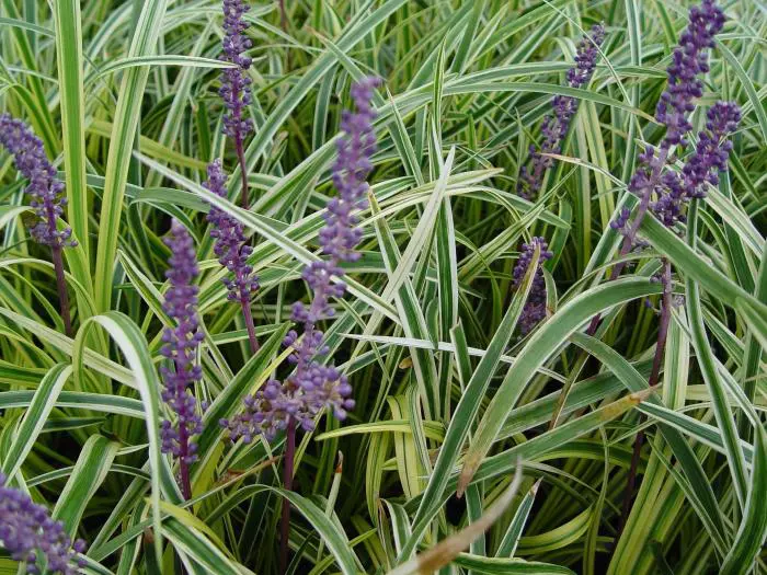 Liriope graminifolia 'Ariaka-janshige' is een grasachtige plant met witzilver/groen gestreept blad dat mooi combineert met de lilablauwe bloemaren.