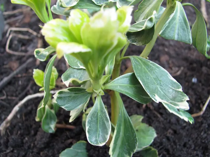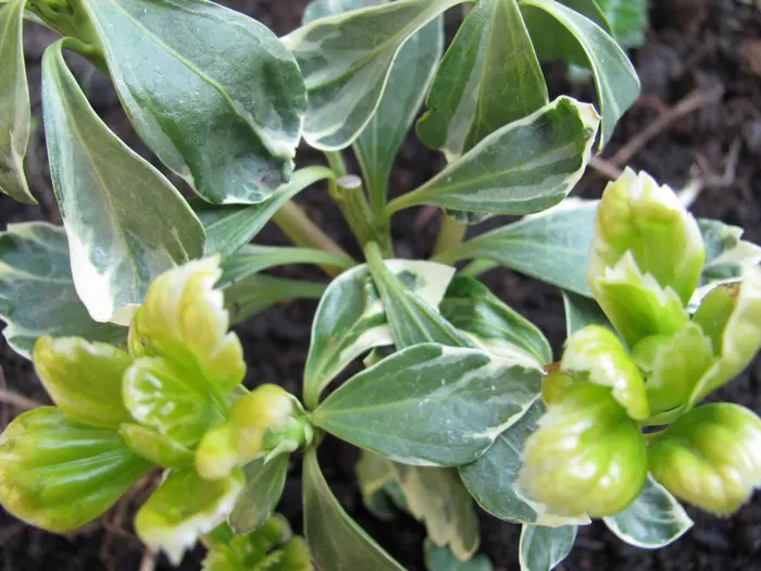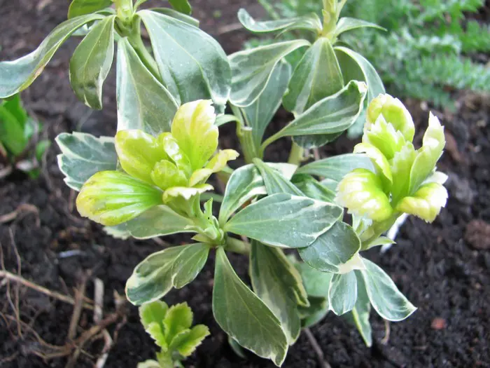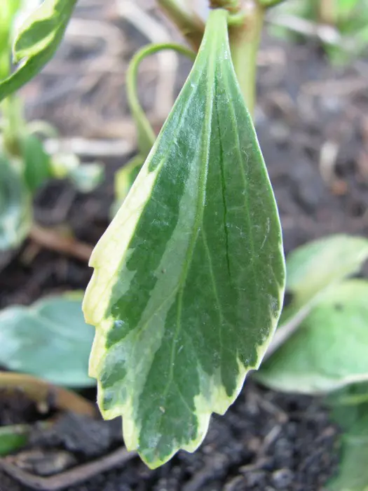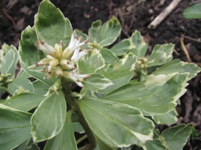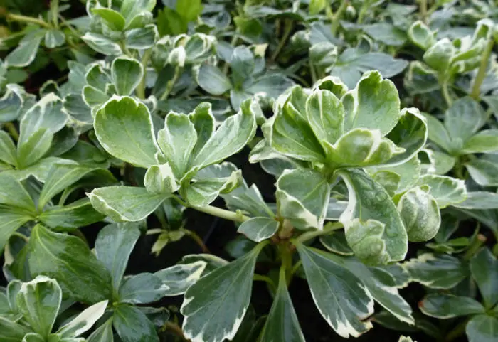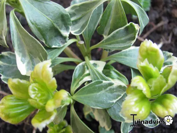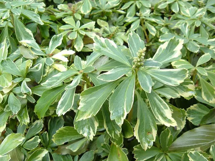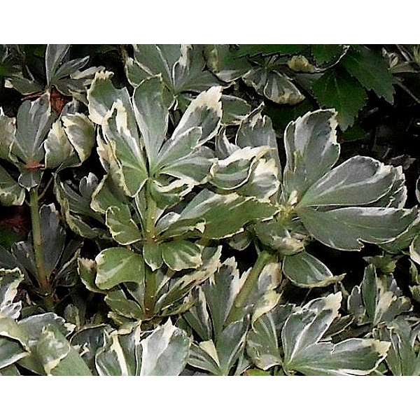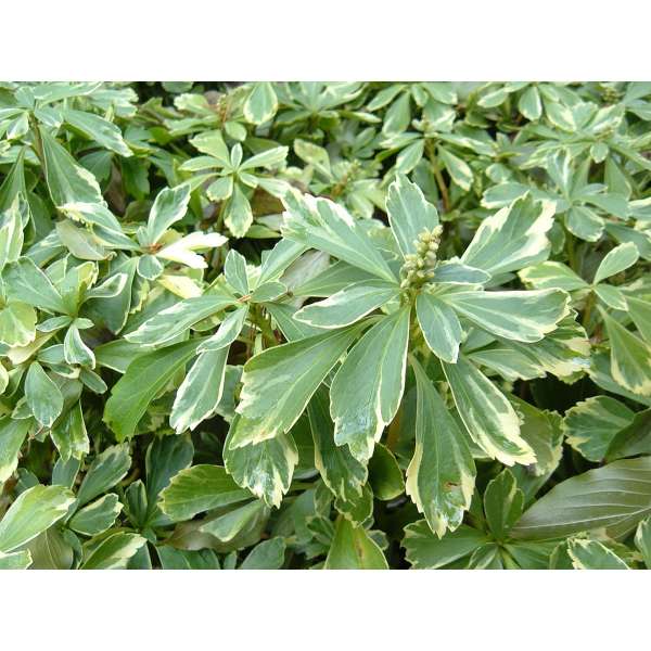 Pachysandra terminalis 'Variegata'is een bodembedekkende halfheester met een prachtig, glanzend zilvergerand, donkergroen blad, wintergroen en 5 tot 10 cm lang, ovaal en aan de uiteinden getand. Het blad wordt gelig in de zon.
