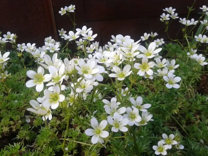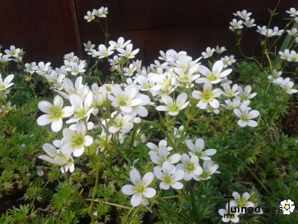 Saxifraga x arendsii 'Schneeteppich' is een rijkbloeiend rotsplantje met een klein frisgroen blad en witte bloempjes op lange steeltjes die soms roodbruin kleuren.