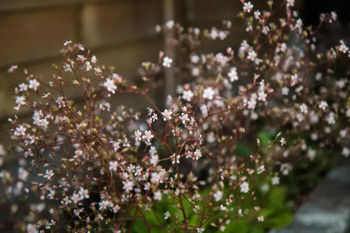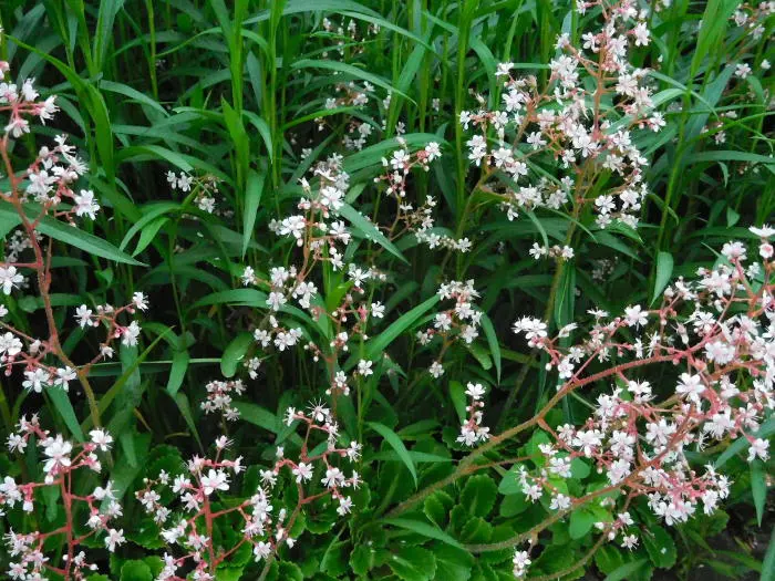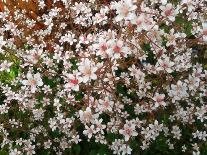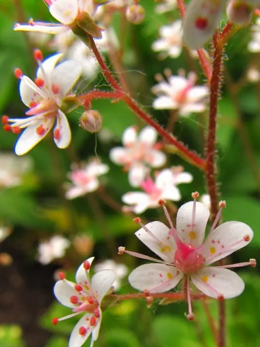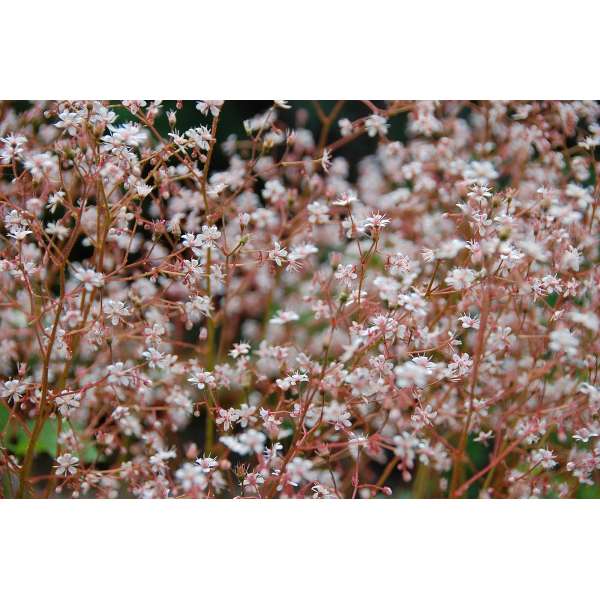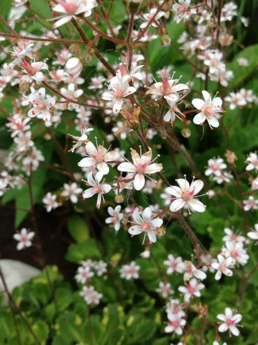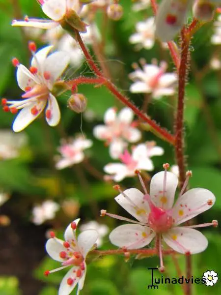 Bloeit in de lente met een wolk op hoge stelenvan rozewitte sterretje met rode vlekjes.