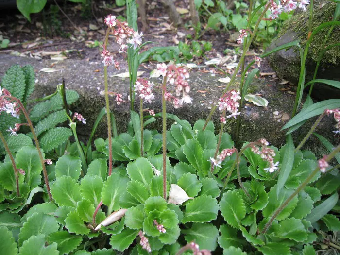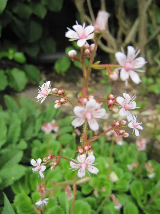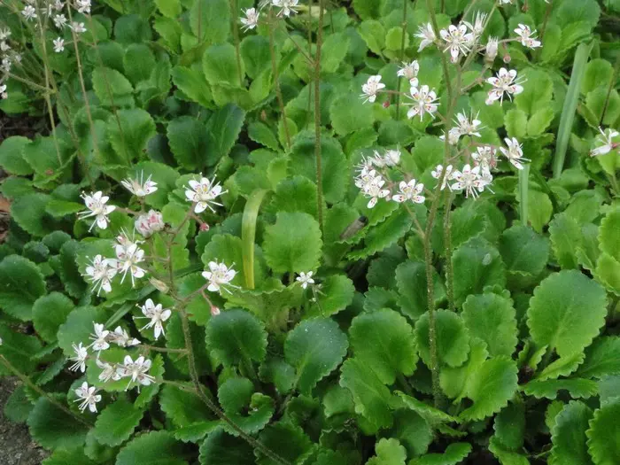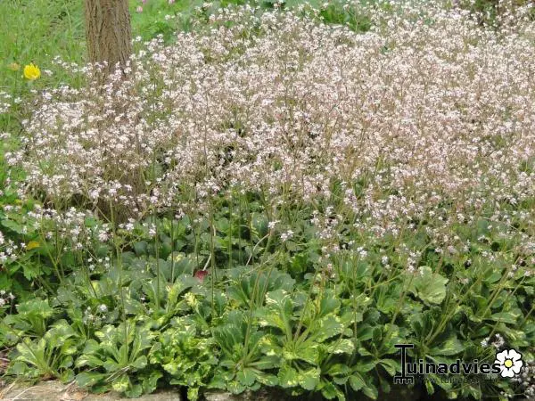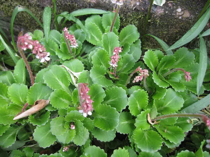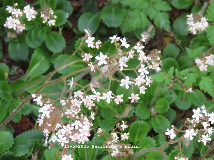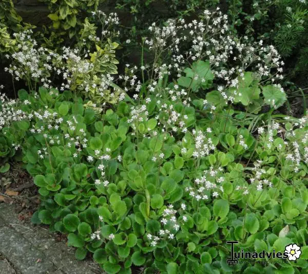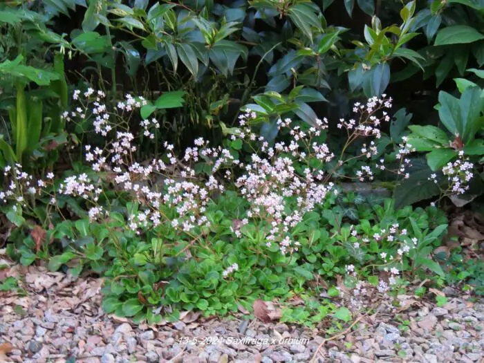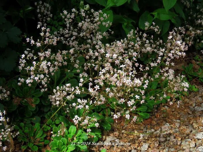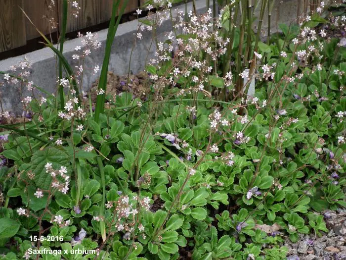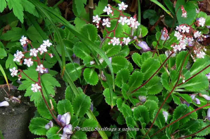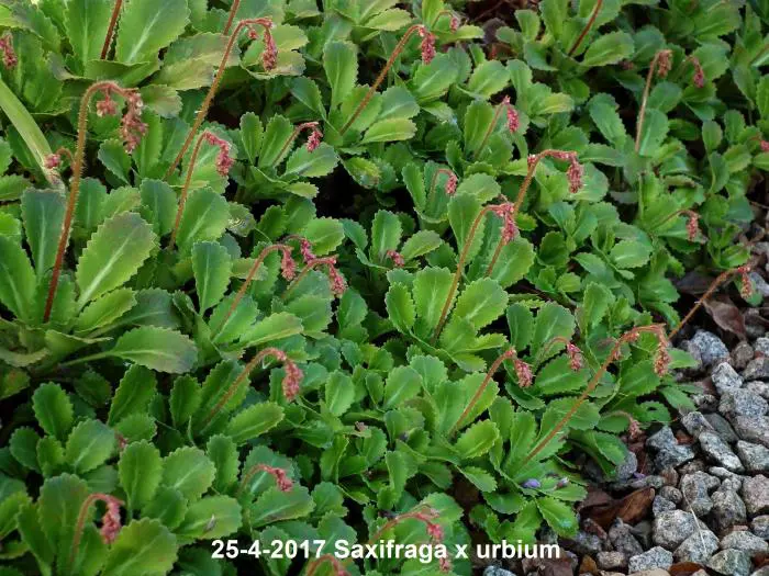 Saxifraga x urbium is een bodembedekkende plant met rozetten van vlezige, glanzend donkergroene lepelvormige blaadjes.
