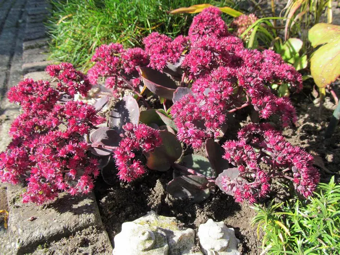 Sedum 'Amber Red' vormt dichte zoden van grijsgroene bladeren die mooi over de randen van potten kunnen hangen bloeiend met donker kersenroze bloemschermen.