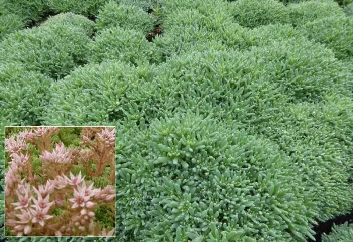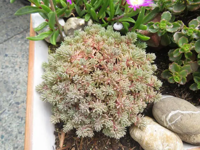 Sedum hispanicum vormt een mooie pol van licht blauwgroene vlezige blaadjes verkleurend in het najaar naar een meer roodgroene tint.