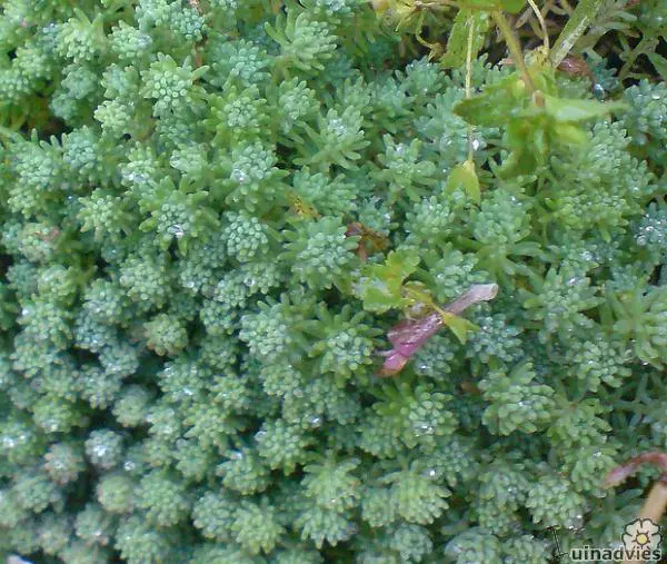 Zodevormende vaste plant met witte bloempjes aan klein platte trosjes.