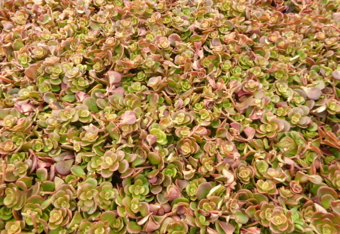 Sedum makinoi is een laaggroeiende vetplant met aan rode steeltjes, vlezige groene blaadjes en gele bloempjes.