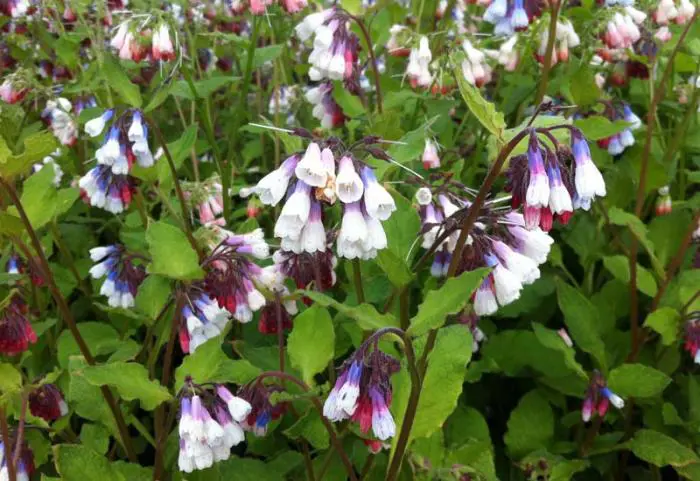 Symphytum grandiflorum 'Sky Blue Pink' is een matvormige plant. Uit de rozerode knoppen bloeien witte buisvormige bloemen met blauw aan de basis.